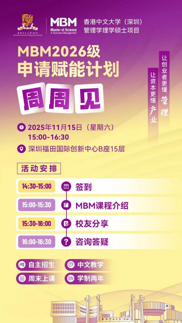 香港中文大学(深圳)管理学理学硕士MBM2026级第四批次招生火热进行中!申请截止时间为2025年12月18日(星期四)。