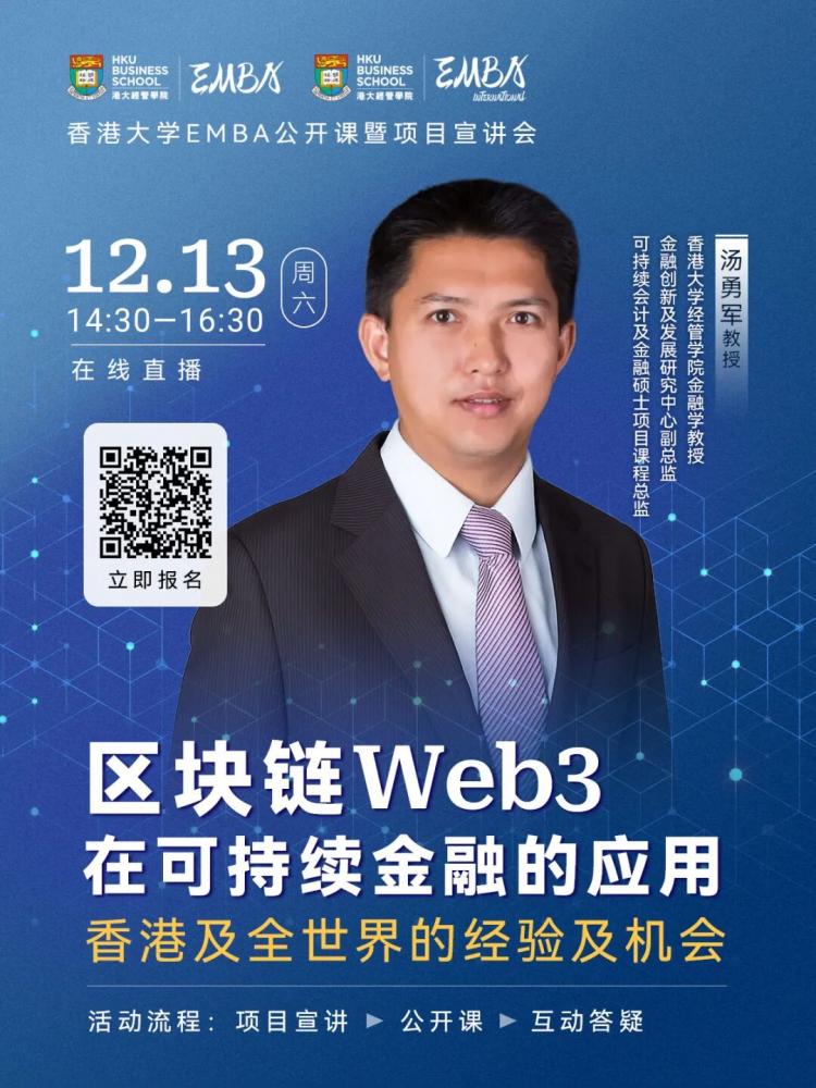 金融还能怎样可持续?请把目光投向香港——在这里,区块链技术与可持续金融的激烈碰撞,正在重塑金融世界的游戏规则。 资产代币化、智能合约、去中心化治理,这些曾停留在讨论中的概念,如今已在香港落地生根。从绿色债券发行到碳资产交易,从本地市场创新到全球经验整合,技术正为可持续金融注入新动能,让每一分绿色资本都能找到精准的价值出口。 12月13日(周六)14:30-16:30,香港大学EMBA线上公开课重磅来袭!汤勇军教授亲授公开课《区块链Web3在可持续金融的应用:香港及全世界的经验及机会》,欢迎提前抢占名额,预约直播!