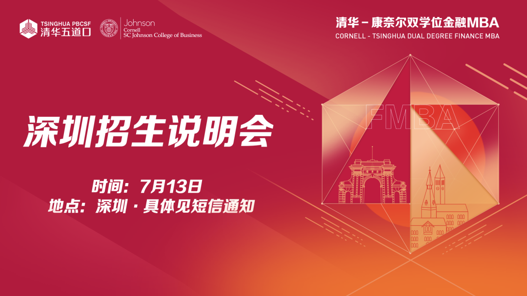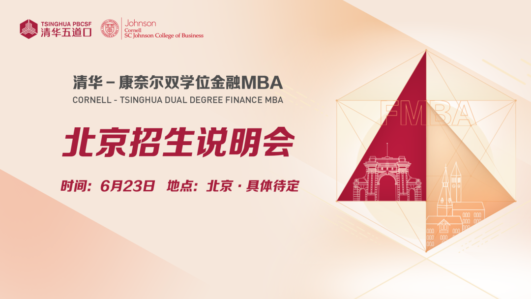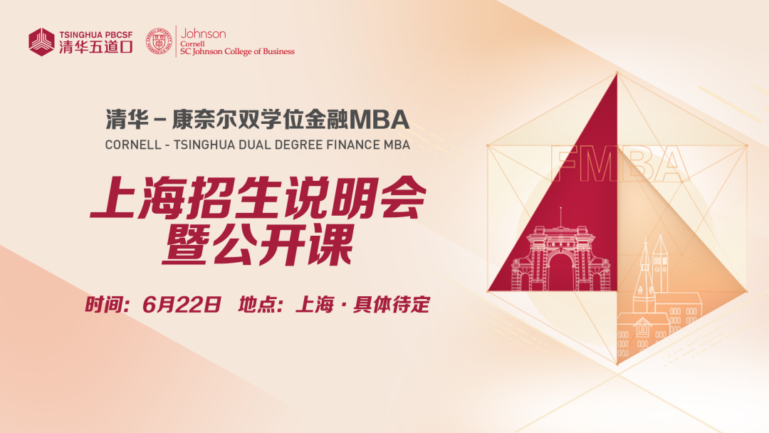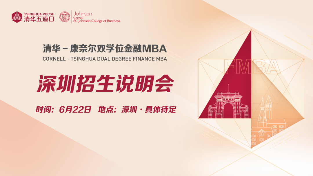 清华-康奈尔双学位金融MBA项目将于6月21日在深圳、上海,6月24日在线上,6月25日在北京举行一...