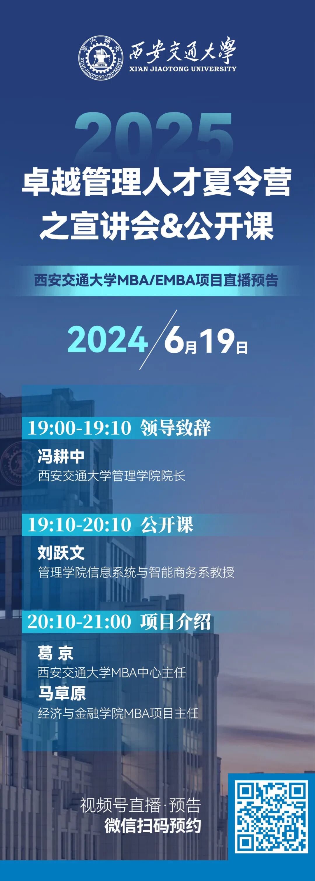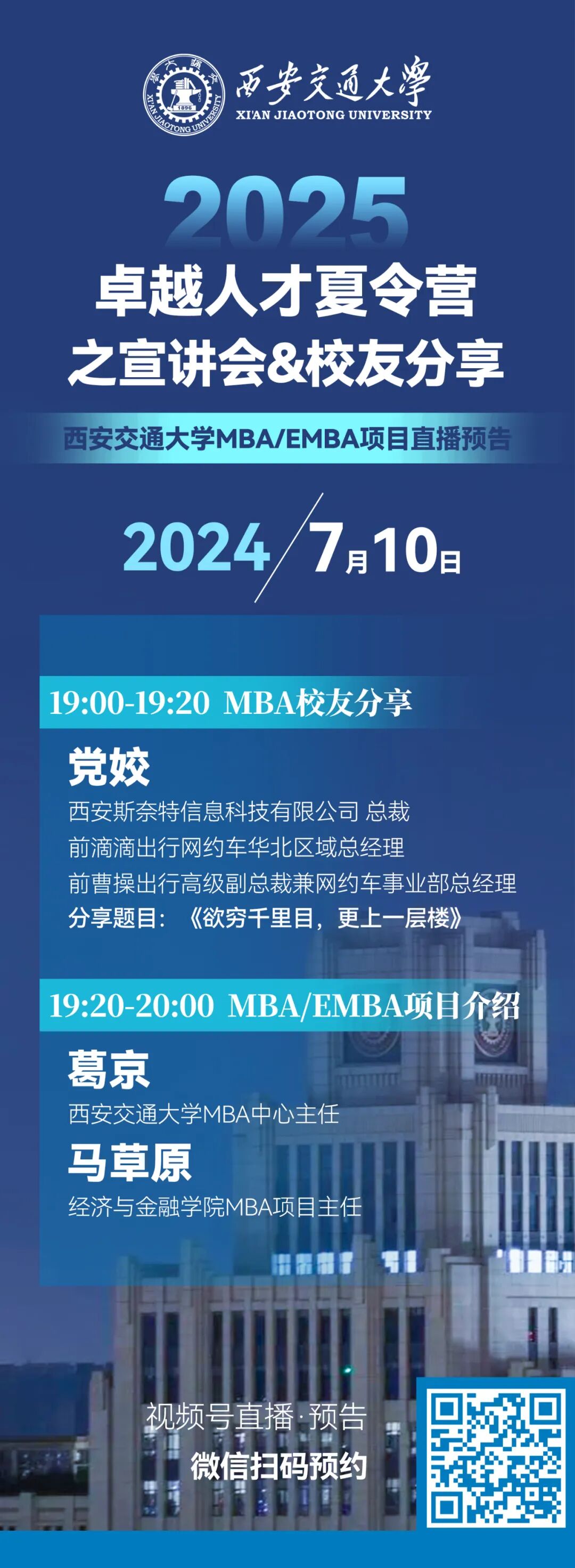 新闻 MBA 2024-07-18 15:11直播预告 | 2025西安交通大学MBA/EMBA项目“卓越管理人才夏令营”之宣讲会&校友分享