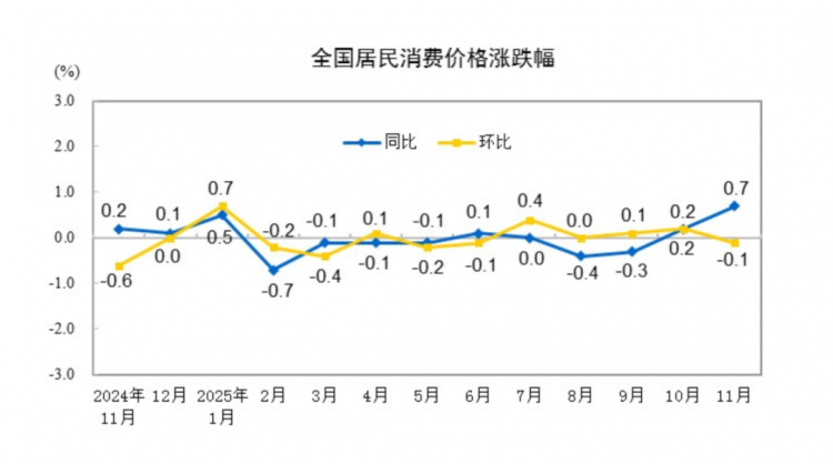 12月10日,国家统计局发布的最新数据显示,2025年11月份,全国居民消费价格同比上涨0.7%。其...