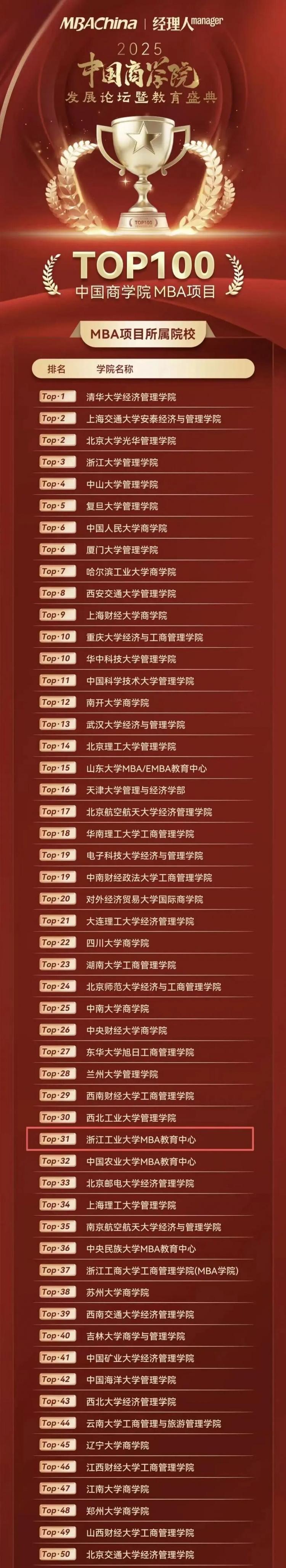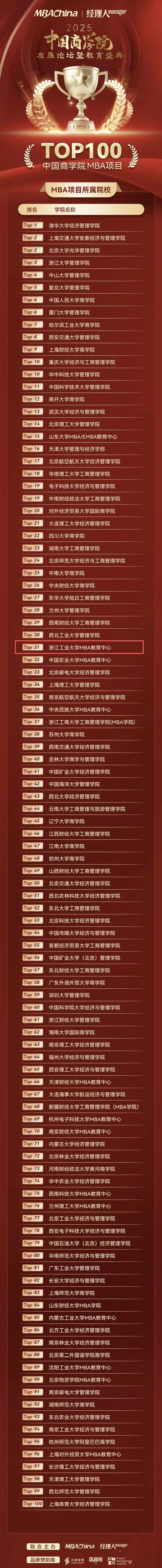 喜报!浙江工业大学MBA教育中心荣获“2025年度中国商学院MBA项目TOP100”!