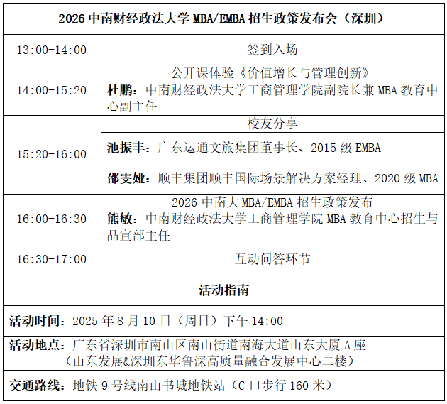 报名 | 融贯经管法、学在中南大——2026中南财经政法大学MBA/EMBA招生政策发布会(深圳)