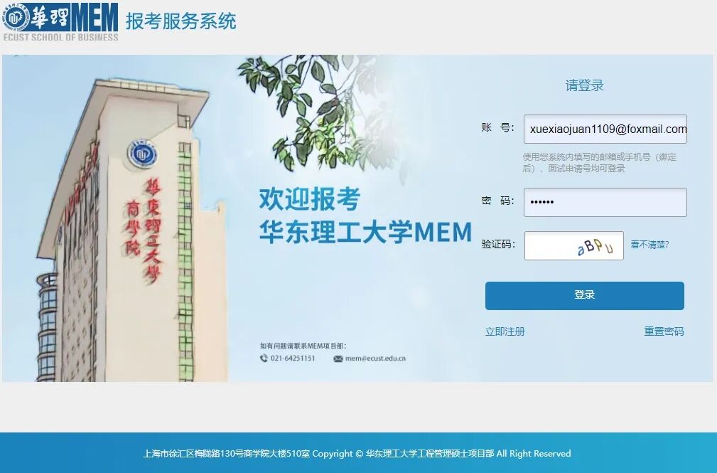 华理MEM报考服务系统https://bsapply.ecust.edu.cn/user/login/mem/85,进行网上注册申请,选择面试批次,并真实、全面、详细地填写信息。注册申请完毕,系统会生成预审号。