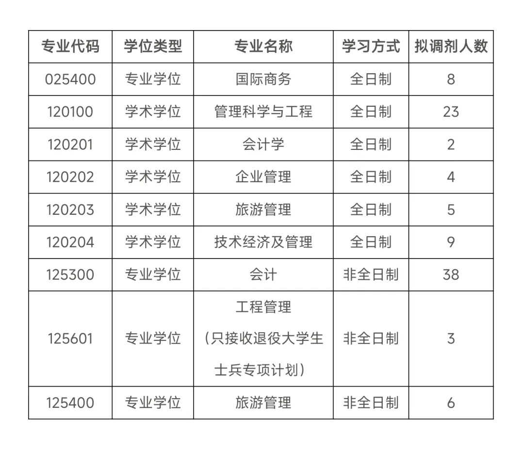 6.第一志愿报考工商管理、公共管理、旅游管理、工程管理、图书情报、审计、会计专业学位硕士的考生,在满足第一志愿报考专业和调入专业国家线要求、调入专业报考条件(含工作年限)的基础上,可申请互相调剂,但不得调入其他专业;其他专业考生也不得调入以上相关专业。