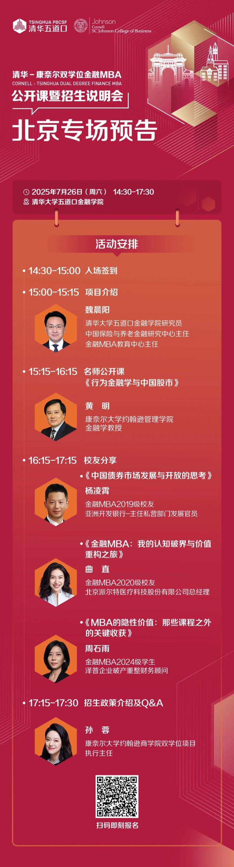 智能总结清华-康奈尔双学位金融MBA项目公开课堂暨2026级招生说明会将于2025年7月26日14:30-17:30在北京举办。会上,清华大学魏晨阳将解读招生政策与培养体系;康奈尔大学黄明将带来《行为金融学与中国股市》公开课。此外,金融MBA校友杨凌霄、曲直将分别分享债券市场及自身认知破界经历,在读学生周石雨揭秘项目复合赋能体系。康奈尔大学孙蓉将现场答疑。这是深度接触顶尖金融教育、聆听前沿见解、对话校友和学生的好机会。采取扫码报名,主办方会在活动前统一发参会邀请信息,活动为“预报名-邀请制”,邀请仅限本人使用。
