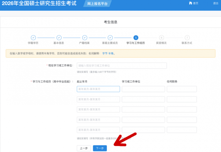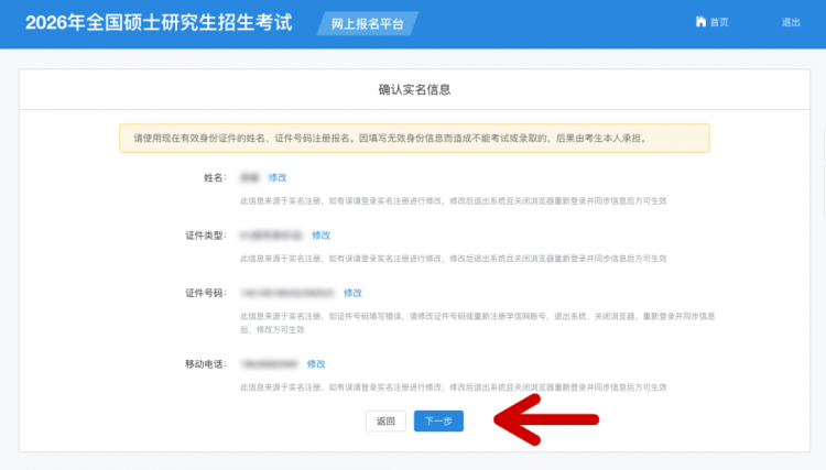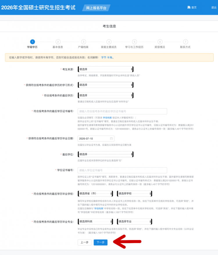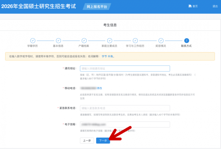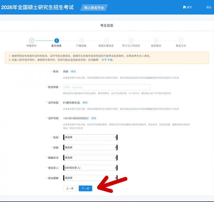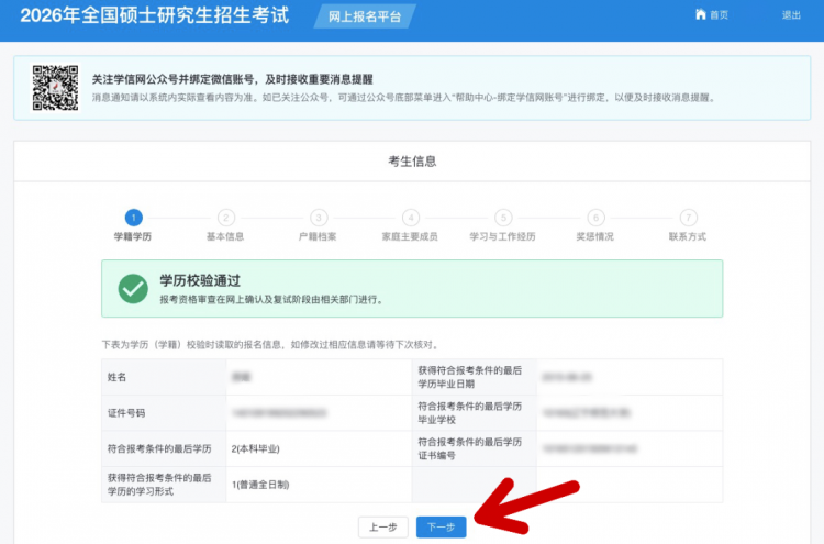 9.填写完毕后,系统会自动进行学籍学历校验。审核通过后,请点击进行【下一步】。
