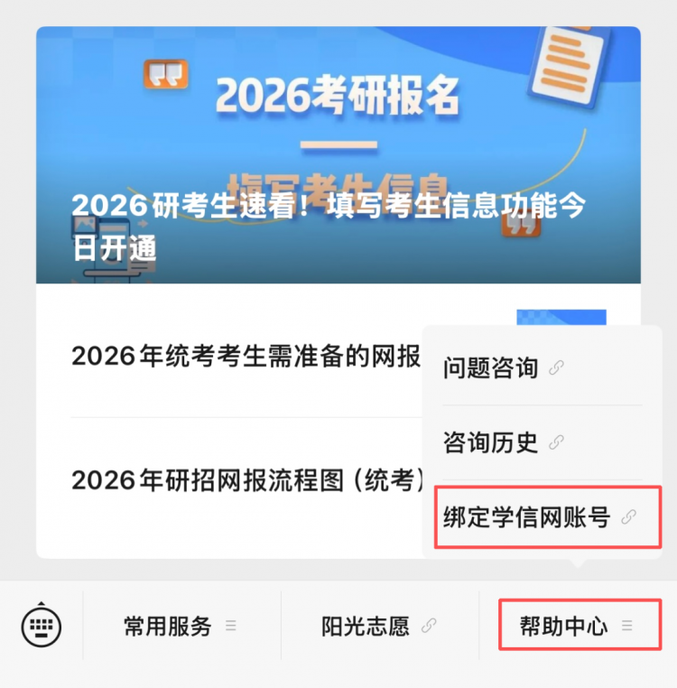 2)在“帮助中心”菜单栏里,选择“绑定学信网账号”: