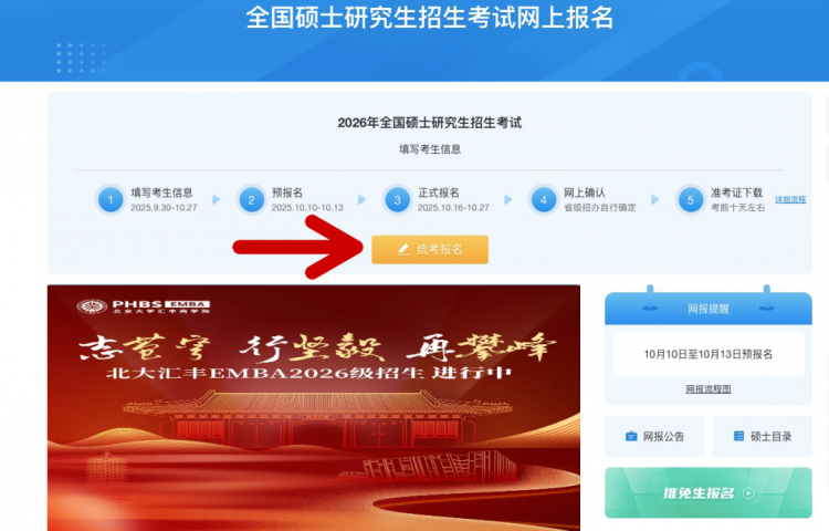智能总结恭喜通过初审和面试的考生成为北大汇丰EMBA2026级“准”新生。2026级EMBA网上报名分预报名(2025年10月10日至13日9:00 - 22:00)和正式报名(2025年10月16日至27日9:00 - 22:00),二者效力相同。研招网网上报名流程分两步,第一步填写考生信息,需在研招网注册登录,依次填写学籍学历、基本、户籍档案等多项信息,系统自动进行学籍学历校验,未能通过校验的考生应按规定完成核验,还可微信绑定学信网账号接收提醒,全部信息检查无误确认即完成填报;第二步填写报考信息,待(预)报名