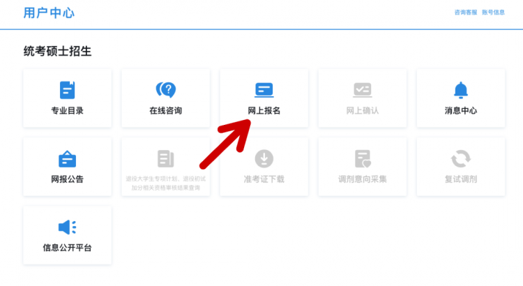 3.回到研招网(https://yz.chsi.com.cn)首页,点击左侧【统考网报】, 进入网上报名页面。