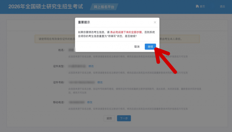 7.进入此页面后,再次确认个人信息,点击【下一步】,选择【继续】。