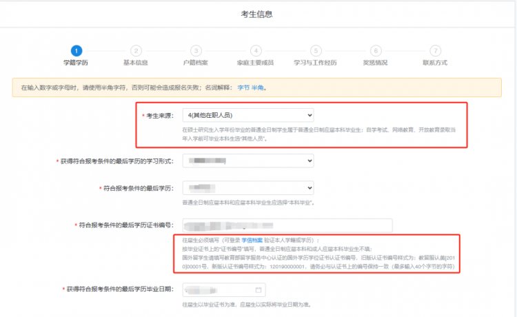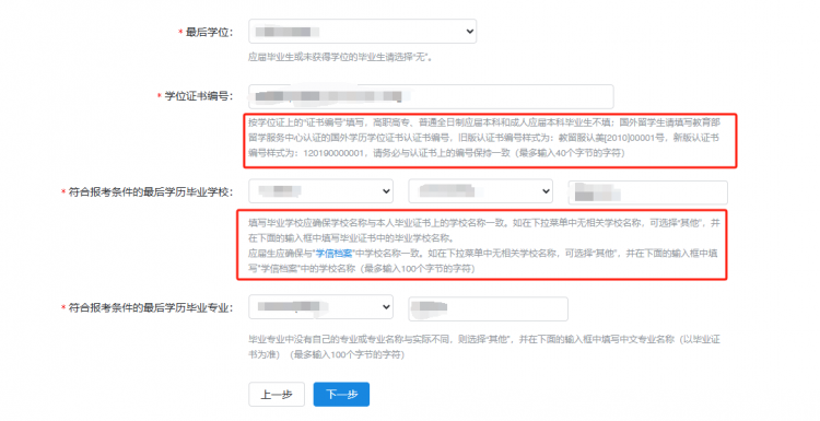△获得符合报考条件的最后学历的学习形式,学历,编号,毕业日期,符合报考条件的最后学历毕业学校、专业:根据自己毕业证情况如实填写