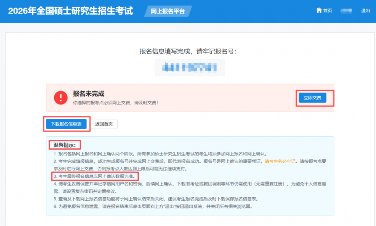 “确认报名”,生成报名号,完成“网上缴费”,并下载报名信息表。