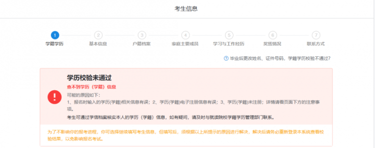◆校验未通过的考生,请首先仔细核对报名填报的信息,如有信息填写错误,请务必在网报期间登录中国研招网进行修改;如信息填写正确但仍无法通过校验,请按照网上确认环节中有关要求提供证明材料。
