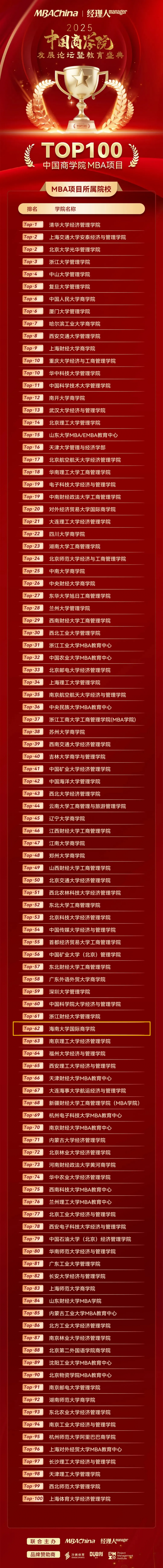 喜报!海南大学MBA荣登2025年度中国商学院MBA项目TOP100榜单第62位!