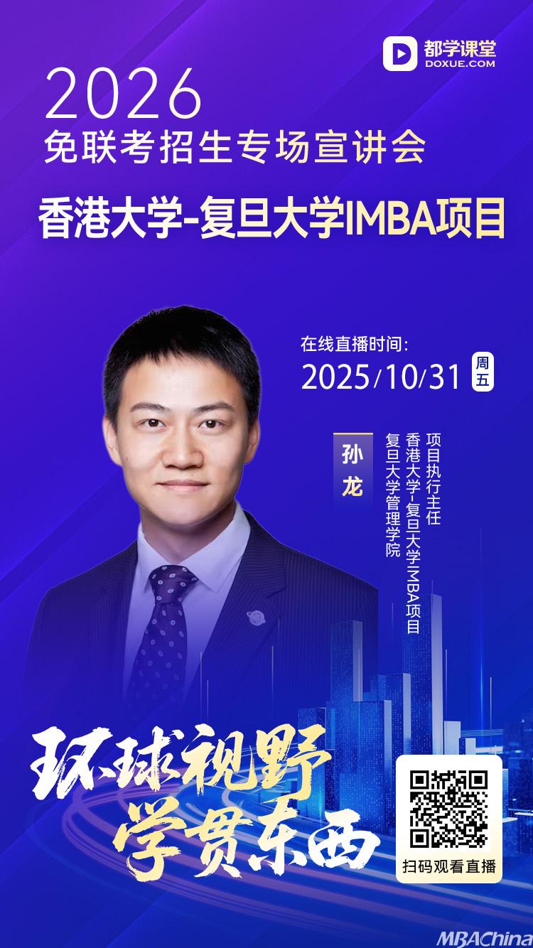 复旦大学管理学院香港大学-复旦大学IMBA项目项目执行主任孙龙老师将亲临直播间,深度解读港大-复旦IMBA项目最新政策与申请秘籍,助你一键解锁“免联考+国际认证+双证效力”的黄金升学通道!