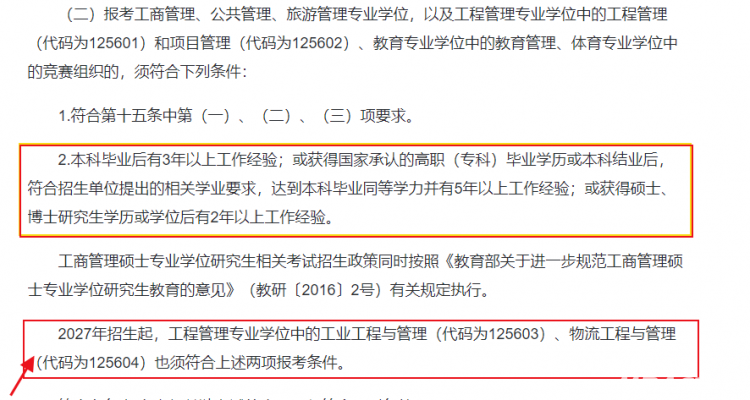 根据新规,2027年招生起,工程管理专业学位(代码 1256)中的工业工程与管理(125603)和物流工程与管理(125604),将正式要求 “本科毕业后有 3 年以上工作经验”,与工程管理(125601)、项目管理(125602)的报考条件保持一致。这意味着 2027 年毕业的本科生,将无法直接报考这两个方向,必须积累相应工作年限后再报考,2026 年是应届生报考这两个专业的最后机会。