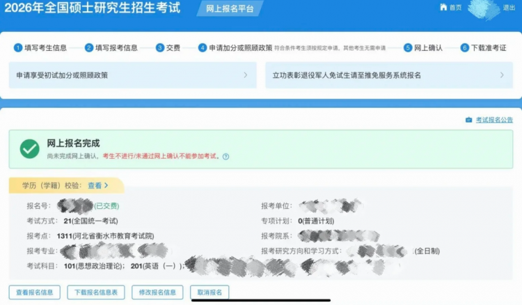 请考生确认,如不符合条件,务必在10月27日22:00前登录研招网修改报考信息或重新报名,否则不允许参加考试。