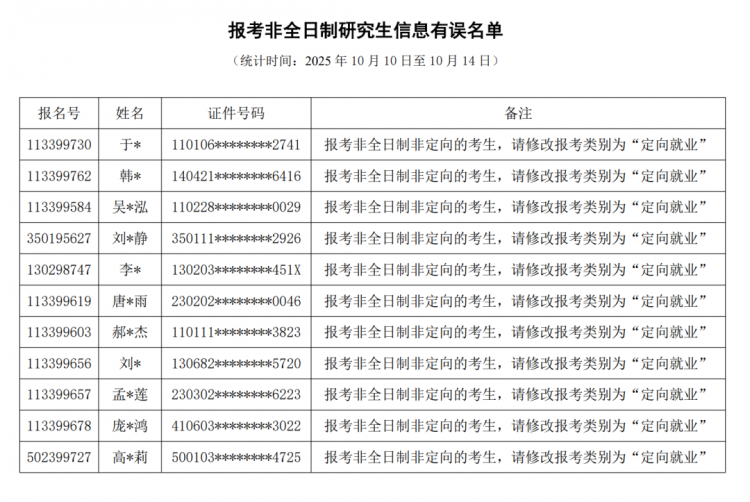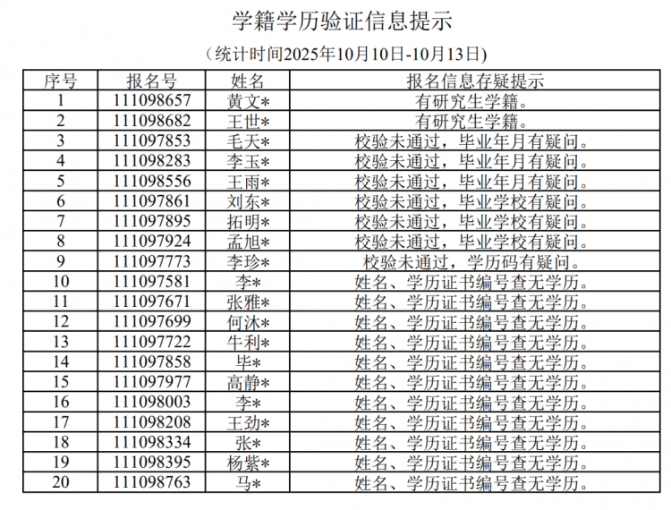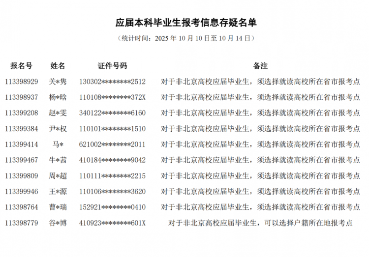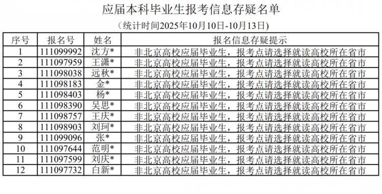 很多同学的学籍学历校验未通过,以及报考点选择出现失误。请名单中的考生于正式报名期间(2025年10月16日至27日)尽快修改报考信息,后续学校报考点还将继续发布报名信息存疑提示,请考生及时查看。