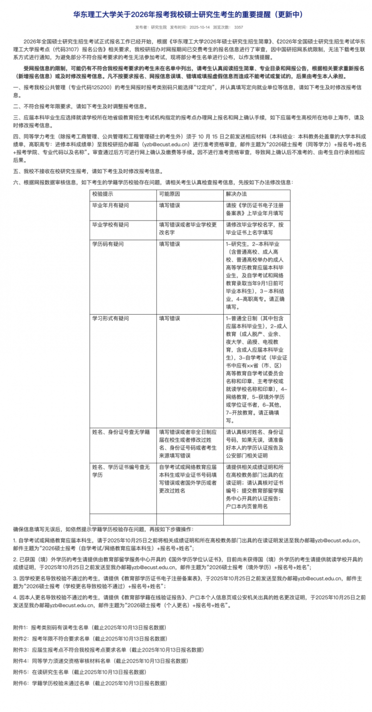 华东理工大学发布了《华东理工大学关于2026年报考我校硕士研究生考生的重要提醒》: