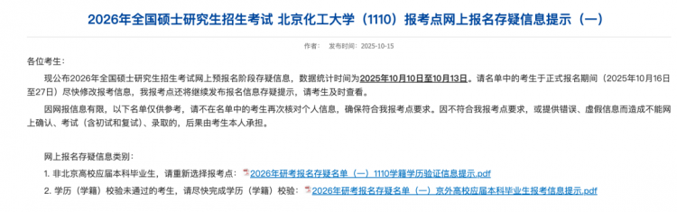 北京化工大学发布《2026年全国硕士研究生招生考试 北京化工大学(1110)报考点网上报名存疑信息提示》。