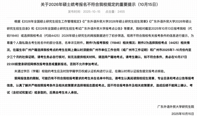 广东外语外贸大学发布《关于2026年硕士统考报名不符合我校规定的重要提示》。