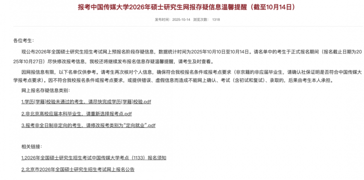 中国传媒大学发布《报考中国传媒大学2026年硕士研究生网报存疑信息温馨提醒》