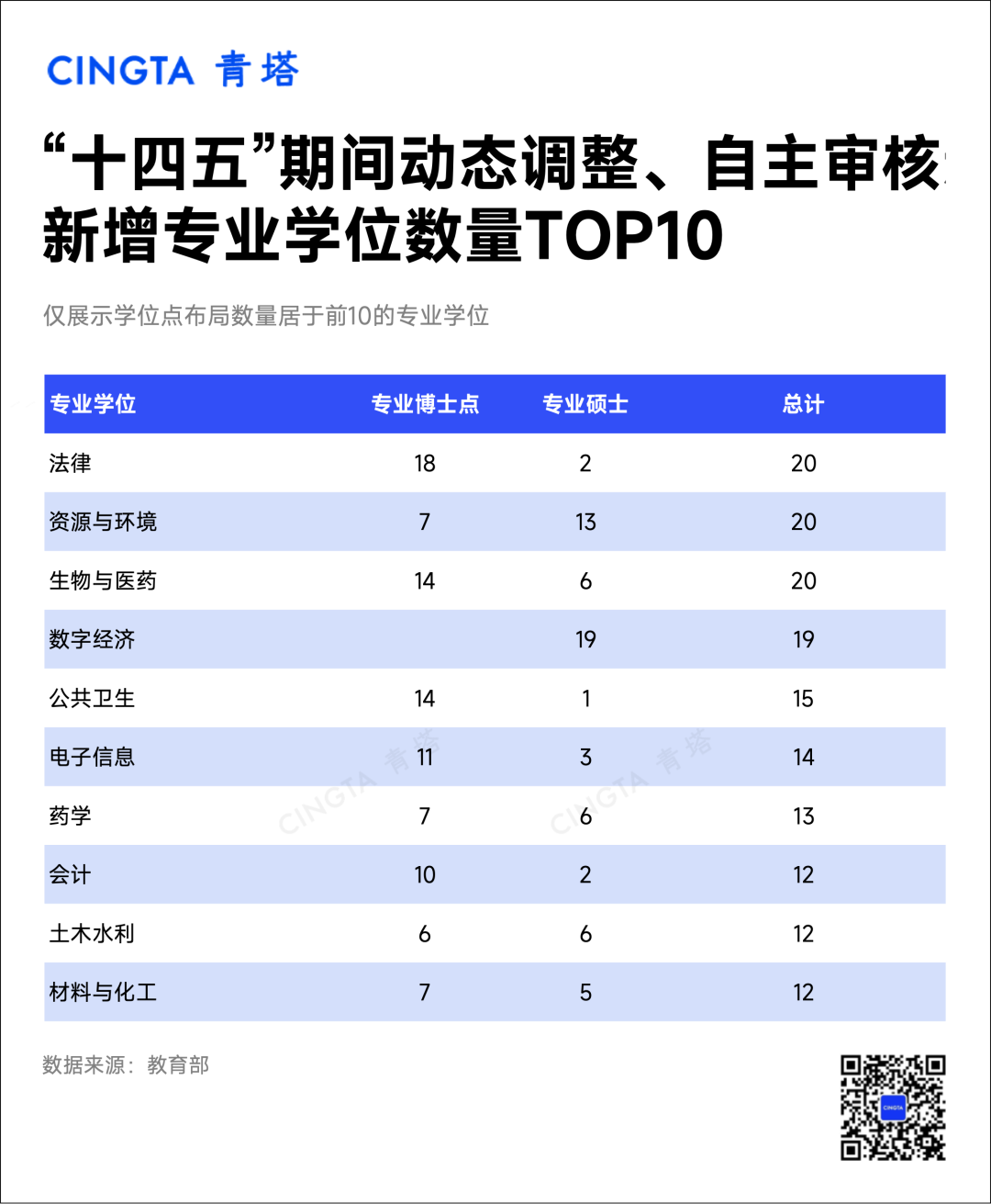 在专业学位上,法律、生物与医药、资源与环境各新增20个学位点,并列第一。数字经济、公共卫生分别新增19个、15个学位点,居于第二、第三位。