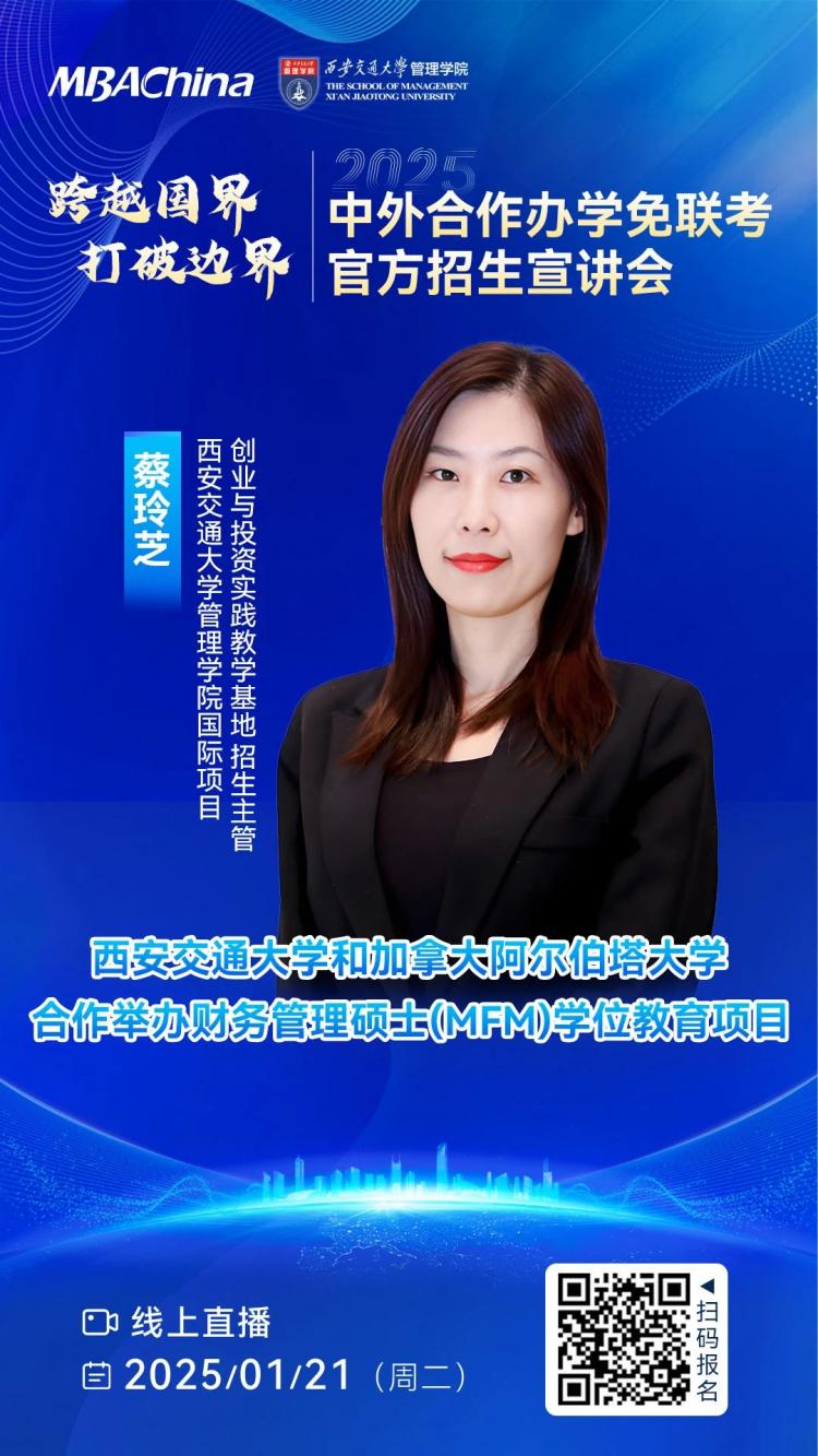 律回春渐,新元肇启。为了响应广大考生追求高质量商科教育、拓宽国际视野的实际需求,1月21日(周二),MBAChina联合国内外众多知名高校线上开启“跨越国界 打破边界”中外合作办学免联考招生专场宣讲会,为广大考生提供多元化、高质量的免联考硕士项目信息,从而更好地了解和申请中外合作办学免联考硕士项目。 西安交通大学管理学院国际项目创业与投资实践教学基地招生主管蔡玲芝老师应邀出席,将为广大考生解读西安交通大学和加拿大阿尔伯塔大学合作举办财务管理硕士(MFM)学位教育项目的最新动态和招生政策。 宣讲会预约通道已开启,欢迎各位考生扫码预约,对话高校招生官,解答备考疑惑,明确报考方向。
